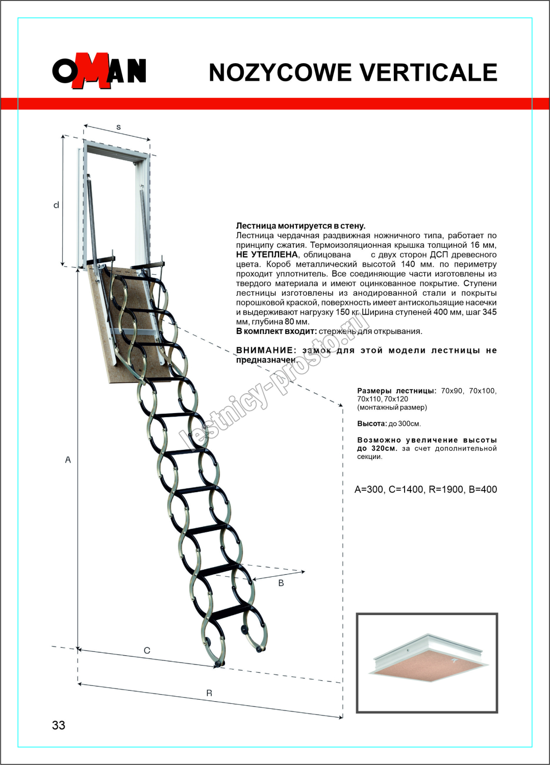 Лестница монтируется в стену. Лестница чердачная раздвижная ножничного типа, работает по принципу сжатия. Термоизоляционная крышка толщиной 16мм, НЕ УТЕПЛЕНА , облицована с двух сторон ДСП древесного цвета. Лестница предназначена для условий, когда чердак утеплен и не требует дополнительной теплоизоляции. Короб металлический высотой 140мм. по периметру проходит уплотнитель.