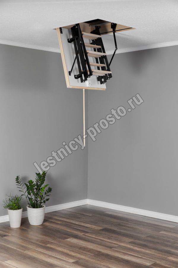 Складная 4-х секционная чердачная лестница. Ступени выполнены из сосны, имеют противоскользящие насечки, направляющие из металла.