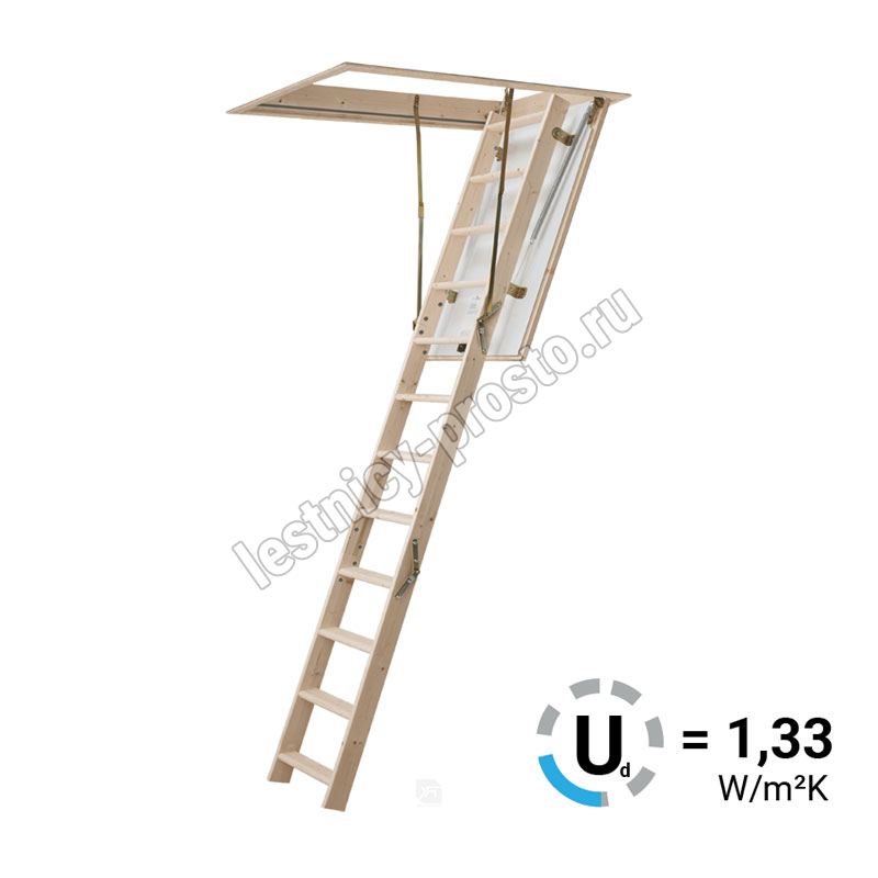 HOBBY 26 - трехсекционная утепленная лестница из скандинавской медленнорастущей ели, отличающейся повышенной прочностью, ступени из сосны, имеют антискользящие насечки.