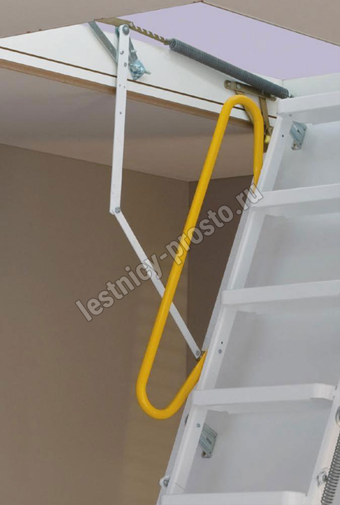 Износоустойчивая лестница для холодных помещений, приспособлена, как для частого использования так и для продолжительного простаивания. Белый цвет крышки люка (толщина 3,3 см) гармонично интегрируется в интерьер помещения и закрывается, маскируясь в один уровень с потолком.