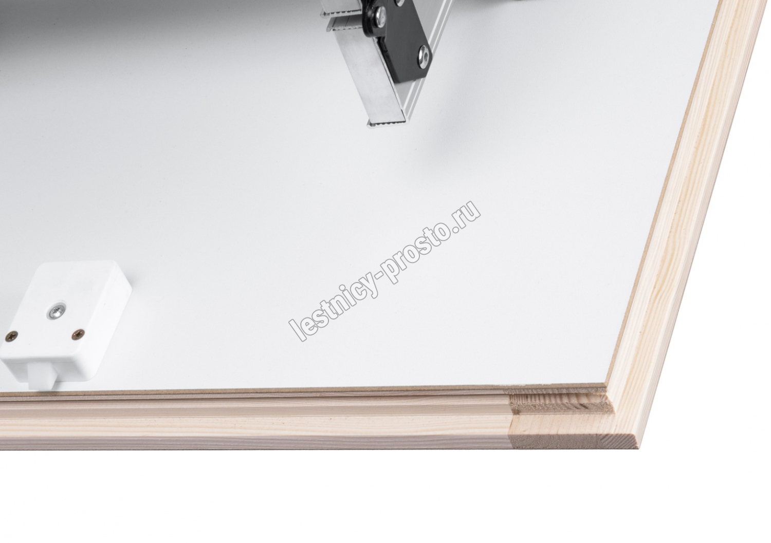 Складная 4-х секционная чердачная лестница. Рабочая поверхность полностью выполнена из алюминия. Термоизоляционная крышка типа "сэндвич" имеет усиленную теплозащиту, облицована с двух сторон ДВП белого цвета. По контуру короба имеется уплотнитель; Все металлические элементы лестницы покрыты порошковой краской.