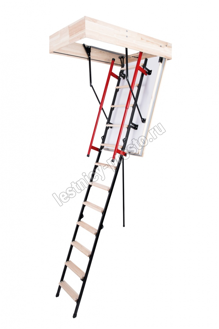 Лестница чердачная, складная, комбинированная 3-х секционная, металлические направляющие/деревянные ступени. Короб люка имеет двухточечную систему запирания. Телескопический поручень имеет внутреннюю пружину и при складывании лестницы служит механическим приводом, что облегчает процесс. Делает его полуавтоматическим. Оборудована дополнительной ступенькой на люке помогающей комфортно подниматься и спускаться. Термоизоляционная крышка типа "сэндвич", толщиной 86мм, утеплена пенопластом, облицована с двух сторон ДВП белого цвета. Лестница подходит для установки в местах с большими перепадами температур. Короб деревянный, высотой 170мм., по периметру проходит уплотнитель. Лестница выпускается для немецкого и английского рынка.