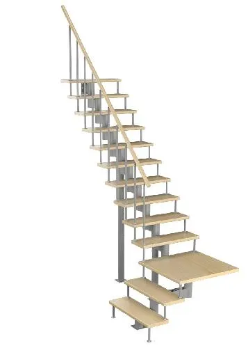 Удобная поворотная лестница на второй этаж. Дополнительные ограждения по первому маршу обеспечивают безопасность при подъеме и спуске, кроме того, небольшой угол подъема открывает всю площадь ступеней. Монтаж осуществляется силами двух человек на объекте по указаниям, приведенным в паспорте на лестницу.