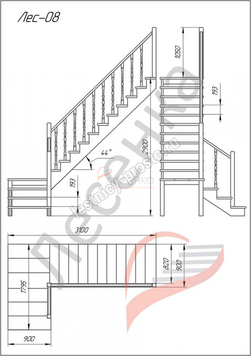 Деревянная межэтажная лестница ЛЕС-08, Сосна с подступенкой