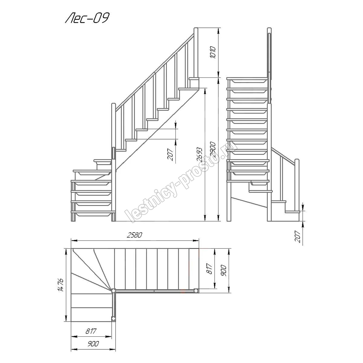 Деревянная межэтажная лестница ЛЕС-09 2900 проем 2580-900, Лиственница