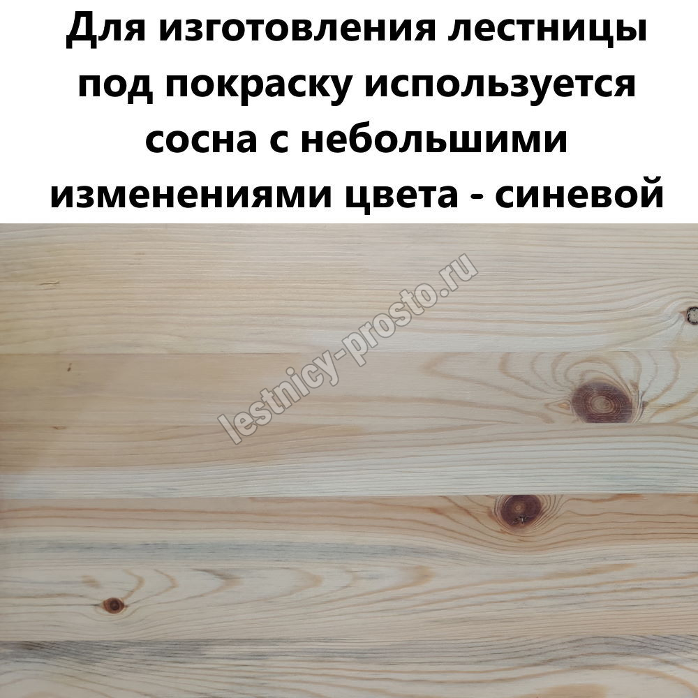 Обратите внимание! Данный вариант лестницы изготовлен из сосны эконом-класса, имеющей заметные серые/синие вкрапления цвета - это не отражается на прочности лестницы, но может быть заметно при покраске в светлые тона.