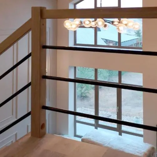 В комплекте: 3 прямых столба и профильный поручень без покрытия, комплект из 3 ригелей из стали (окрашены в цвет каркаса или хром по желанию) диаметром 12 мм. Ограждение начинается со второй ступени.
