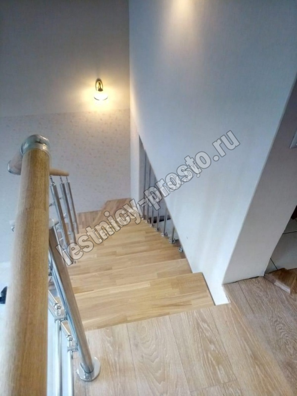 В комплекте буковый поручень, диаметром 50 мм. без какого либо покрытия, стойки из нержавеющей стали (устанавливаются через 1 ступень), диаметром 38 мм,