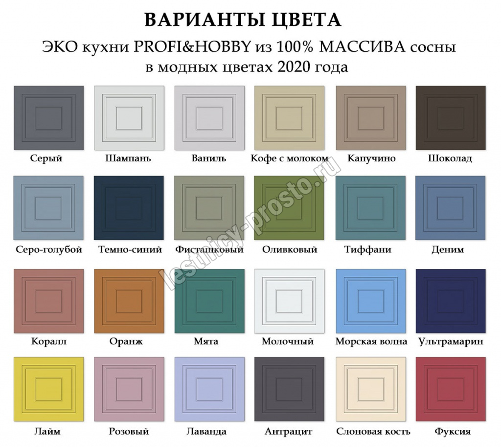 Угловой кухонный гарнитур из 100% массива сосны размером 2 на 1,4 и высотой 2,14 метра (верхние шкафчики 72 см). Цвет на выбор - 27 вариантов (при заказе кухни в нашем интернет магазине просьба указывать название цвета в комментариях).