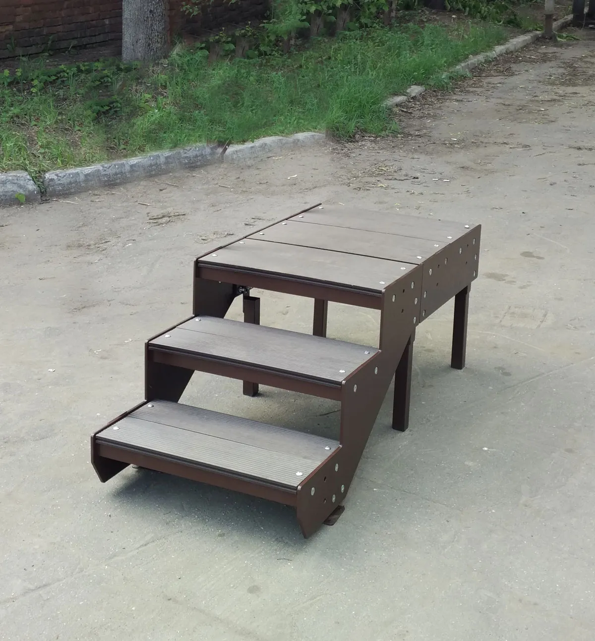 Ступени лестницы состоят из металлической рамки, обеспечивающей необходимую прочность, и покрытия из террасной доски ДПК (древесно-полимерный композит). Ступени не боятся воды и мороза, не теряют со временем свой внешний вид и не требуют ухода.
