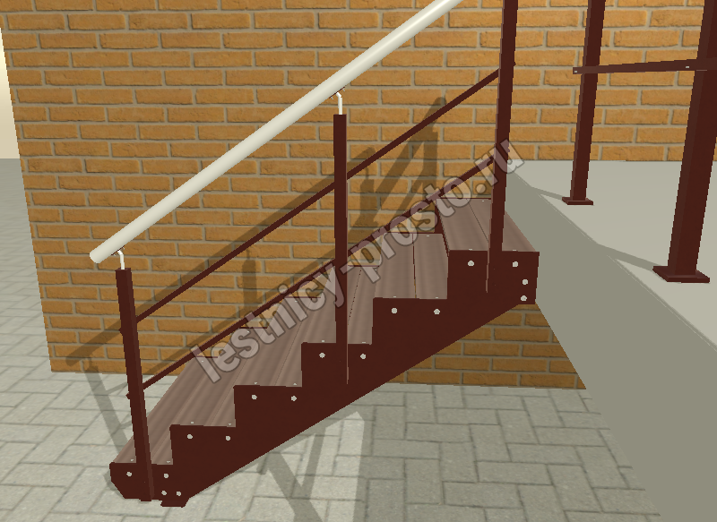 Ограждение типовой лестницы крашеное или из полированной нержавеющей стали. Базовый материал ступеней: террасная доска