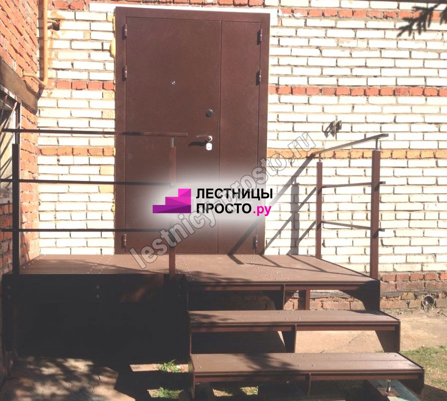 Ступени лестницы состоят из металлической рамки, обеспечивающей необходимую прочность, и покрытия из террасной доски ДПК (древесно-полимерный композит). Ступени не боятся воды и мороза, не теряют со временем свой внешний вид и не требуют ухода.