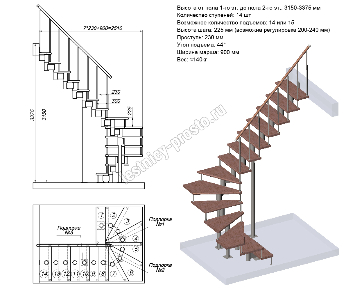 Высота лестницы 3150 - 3375 (14 ступеней) мм