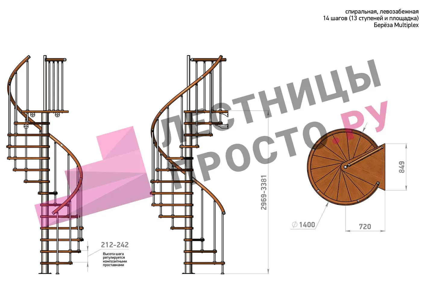 Высота ступеней регулируется с шагом 3 мм. в пределах 212-242 мм., благодаря чему, лестница прекрасно подгоняется под необходимую высоту.