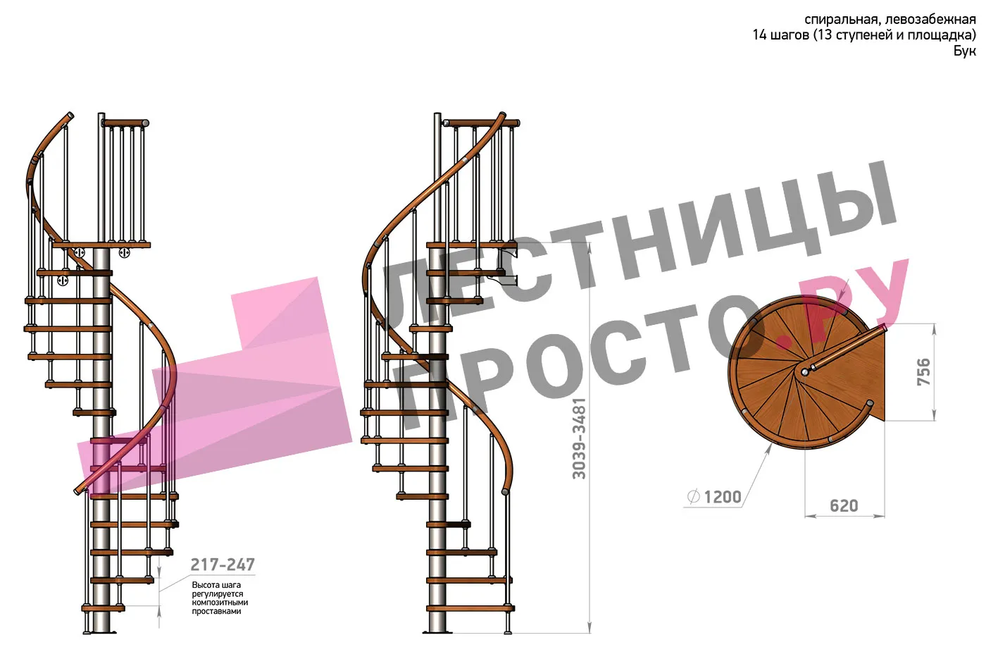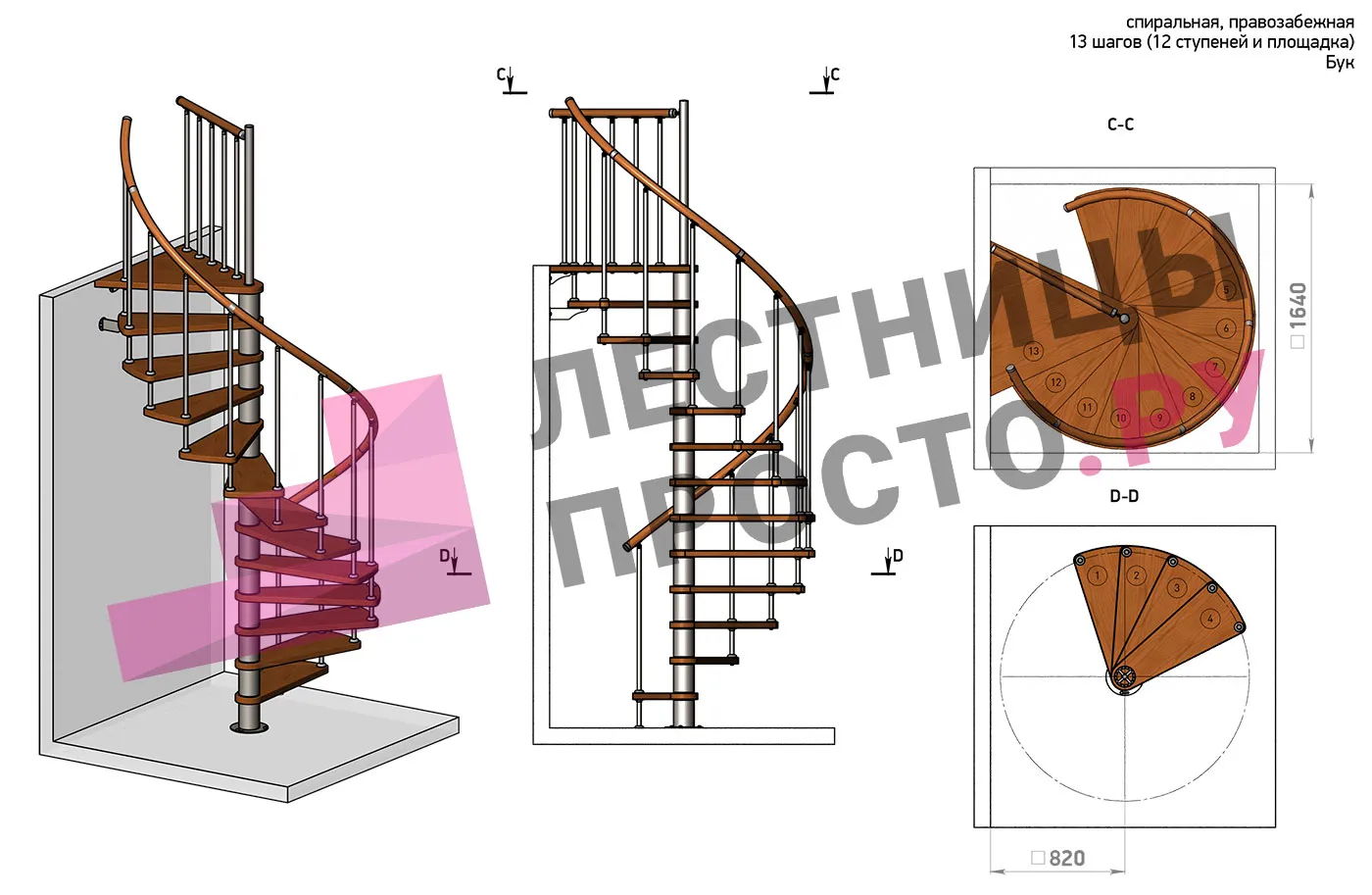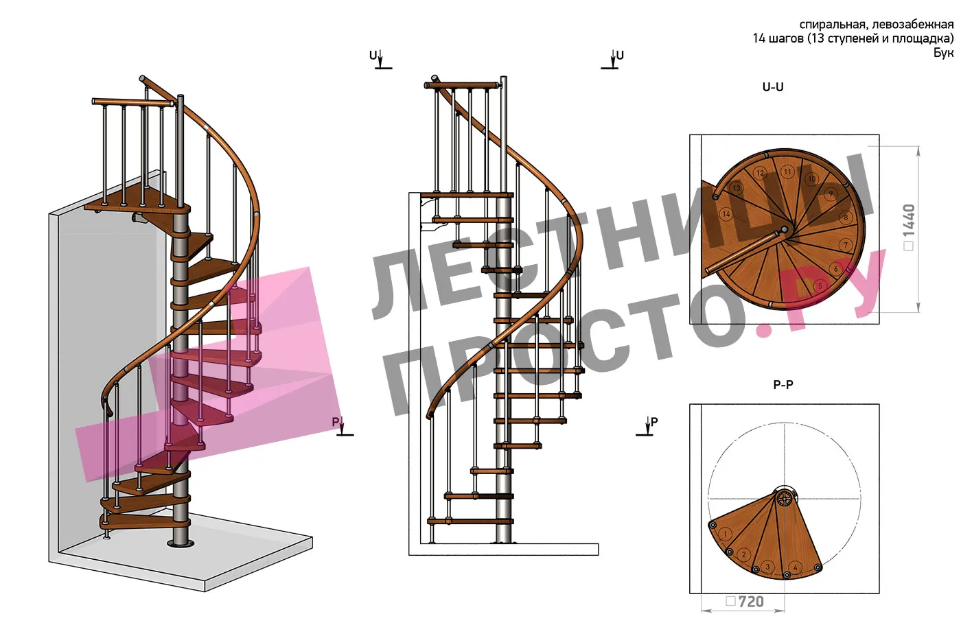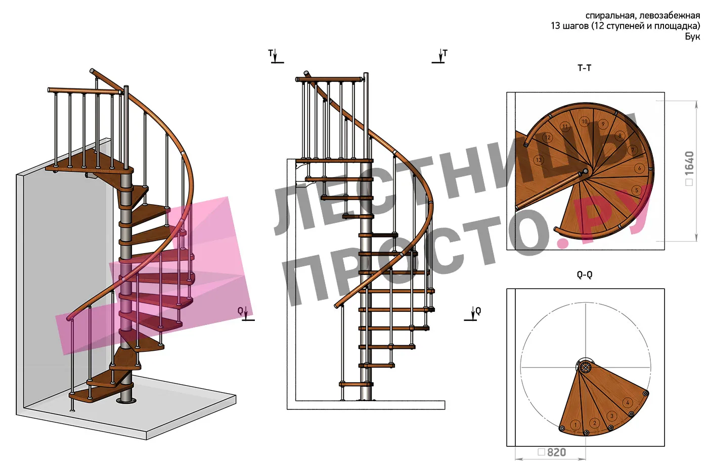 | Винтовая лестница Prosto Spiral Black D140см, h303.9-348,1 см, бук |