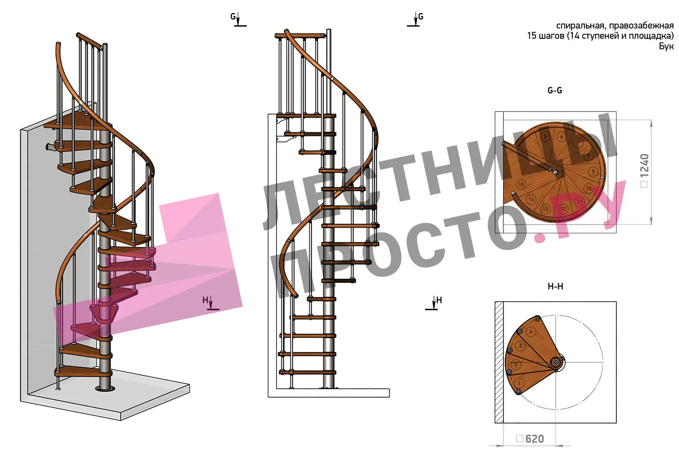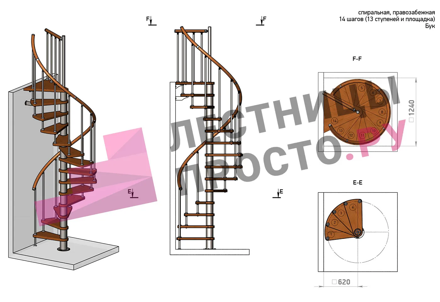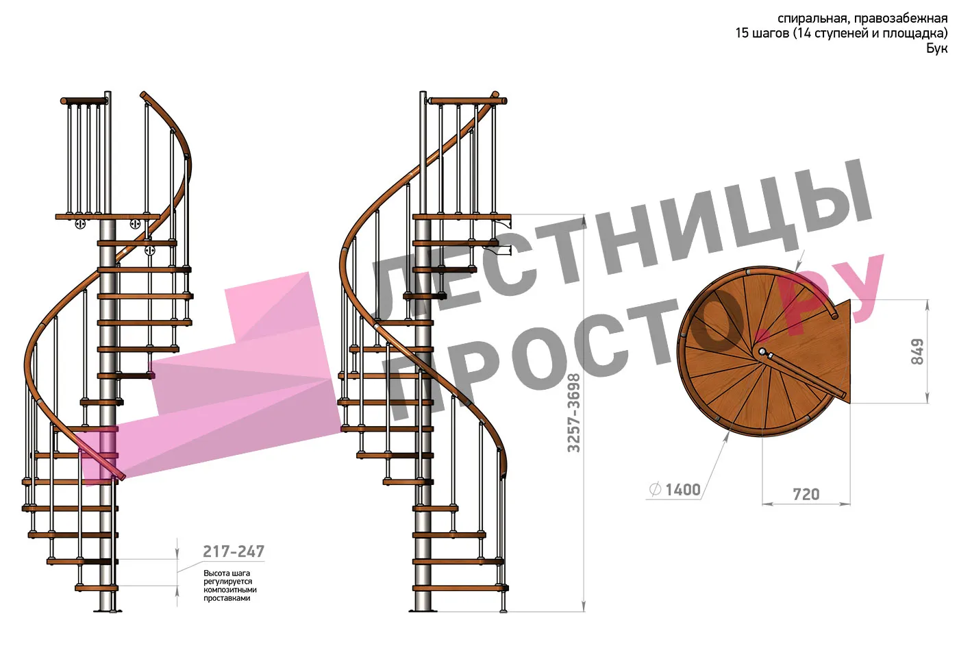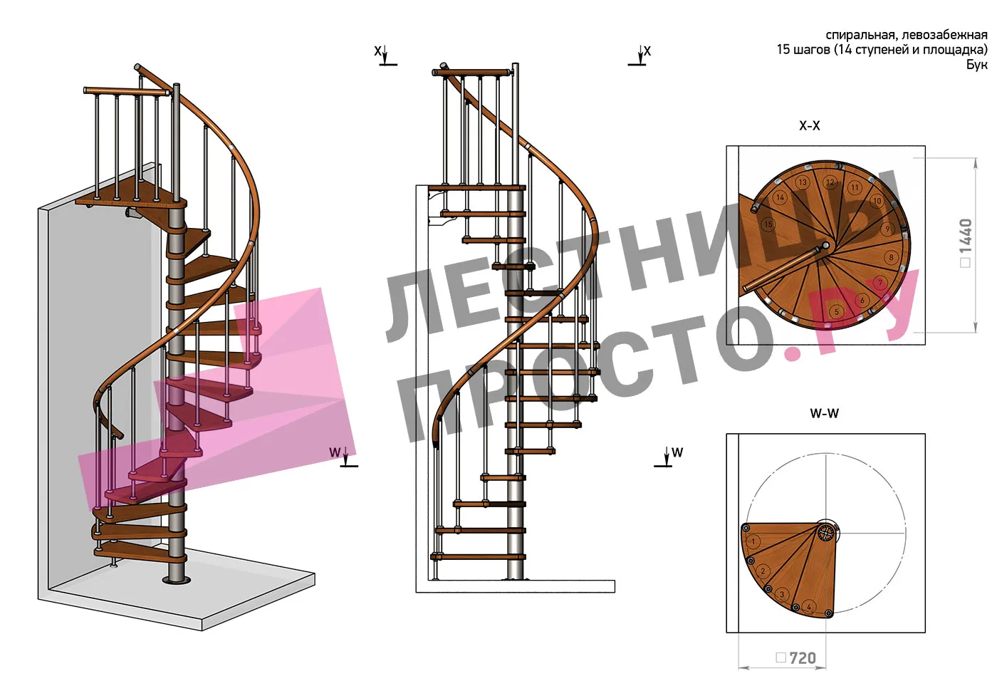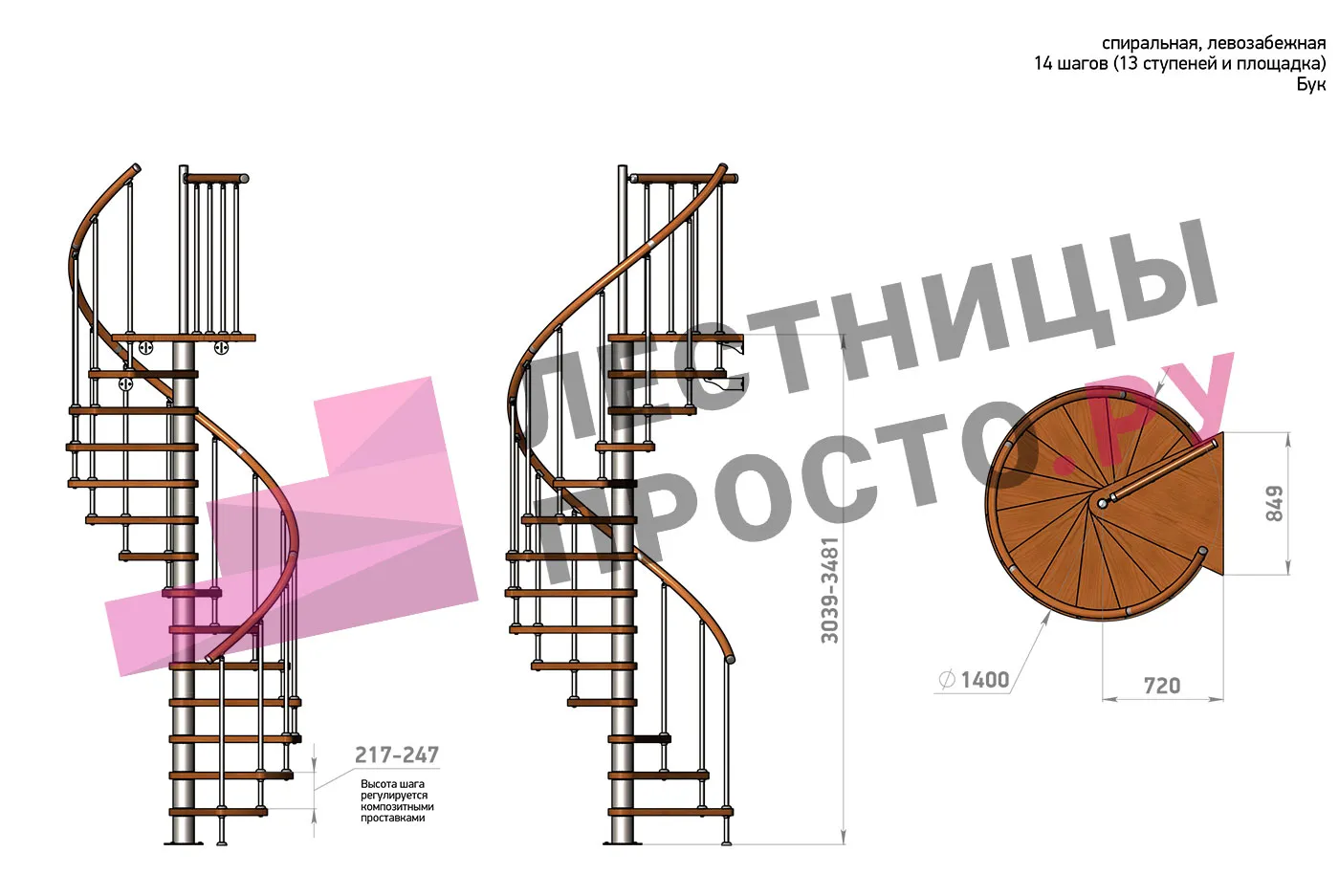 | Винтовая лестница Prosto Spiral Black D140см, h303.9-348,1 см, бук |