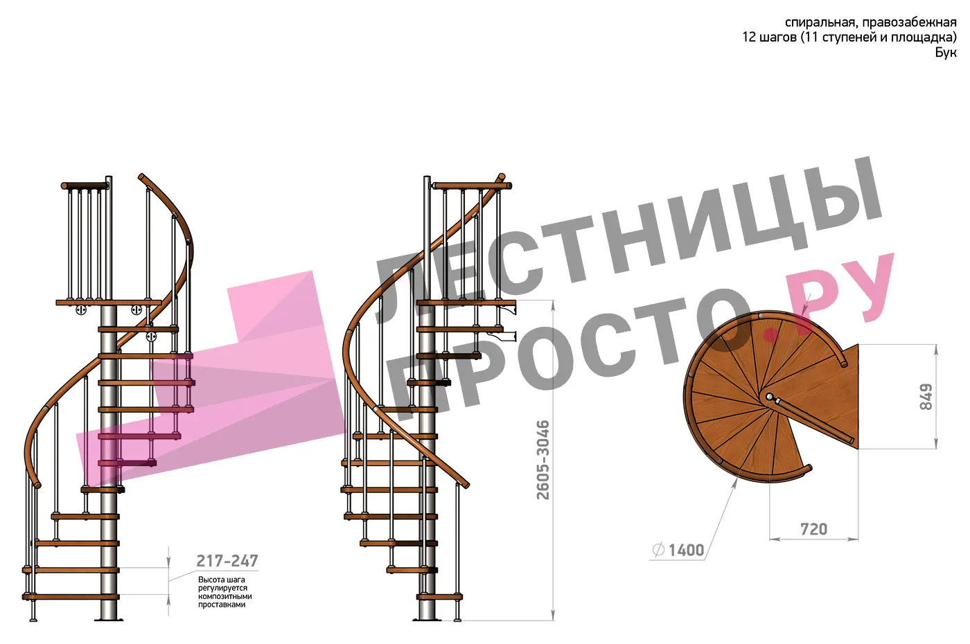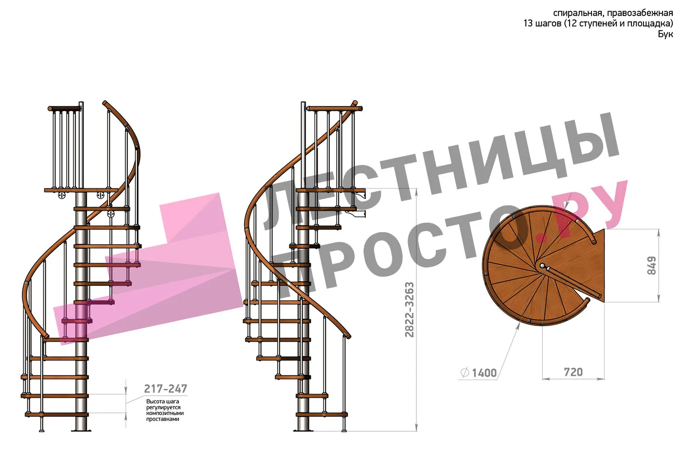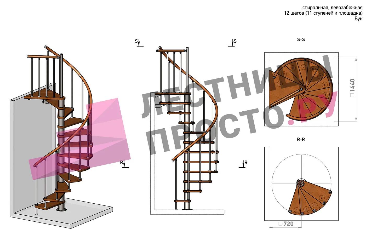 | Винтовая лестница Prosto Spiral Black D140см, h282.2-326,3 см, бук |