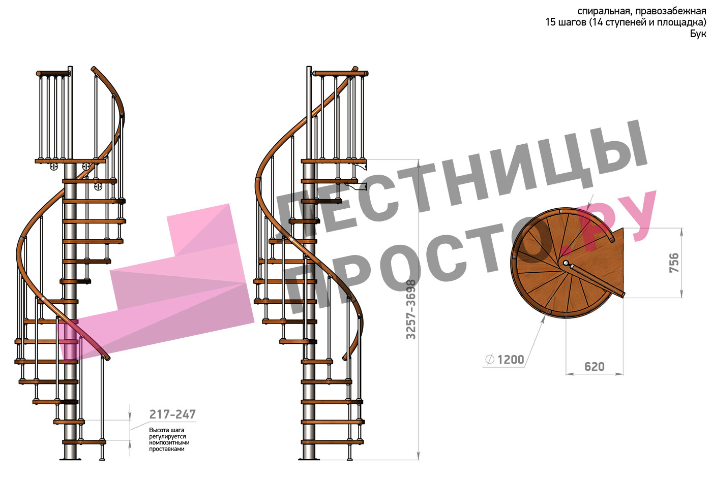 Решение о направлении поворота принимается при сборке лестницы - универсальная конструкция позволяет собрать правозабежную и левозабежную лестницы. Высота ступеней регулируется с шагом 3 мм. в пределах 217-247 мм., благодаря чему, лестница прекрасно подгоняется под необходимую высоту.