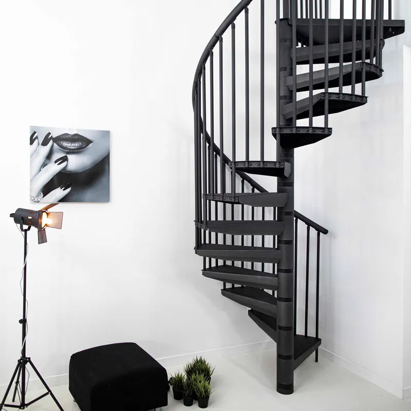 По запросу возможно конфигурирование набора до максимальной высоты 346 см. Все металлические элементы покрыты порошковой краской высочайшего качества графитового цвета, устойчивого к царапинам и механическим повреждениям. Профилированные нескользящие ступени из листового металла в клетку, снабженные небольшим подступенком для большей безопасности. Алюминиевые поручни с высококачественным порошковым покрытием. Напольные перила по запросу, прямые или круглые.