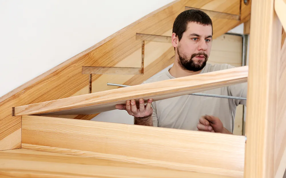 Укладывают на ступени вторую тетивы, контролируя, чтобы все ступени и подступенки попали в пазы.